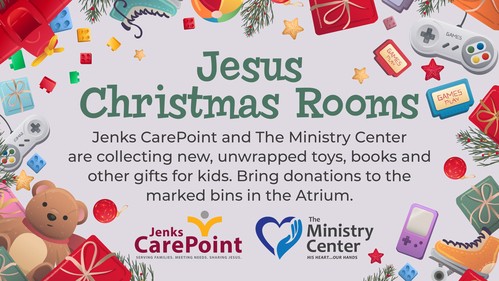 Each year, Jenks CarePoint and The Ministry Center provide our client families the opportunity to shop free of charge for Christmas gifts for their children. Thanks to the generosity of many, last year, more than 1,200 children received Christmas gifts from their moms and dads. We are asking that you help us again this year by donating new, unwrapped toys, books, or other age-appropriate gift items. Our Jesus Christmas Rooms will be open from November 17–December 19. Donations can be dropped off in the marked bins in the South Tulsa Baptist Church Atrium or at Jenks CarePoint Monday through Thursday, 9:00 a.m.–1:00 p.m. (closed Thanksgiving week). Thank you so much for helping to make Christmas a little merrier for so many in need.